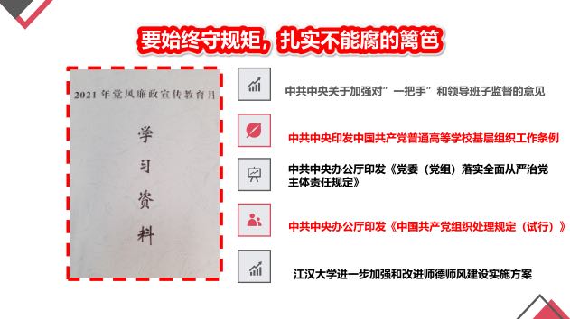 党的十九大报告明确指出:“强化不敢腐的震慑,扎牢不能腐的笼子,增强不想腐的自觉,通过不懈努力换来海晏河清、朗朗乾坤。”这一论断,深刻彰显了我们党对反腐败斗争内在规律认识的崭新高度,也为我们党持续推进反腐败斗争提出了更加明确的路径、举措和奋斗目标。为深入学习、准确把握,切实加以贯彻,离退休工作处党委书记张艳同志为离退休工作处教职工作题为《讲廉洁讲奉献》宣讲,她从三个方面全面深入讲解了要始终知敬畏,拧紧“不敢腐”的阀门;要始终守规矩,扎实“不能腐”的篱笆;要始终明底线,筑牢“不想腐”的堤坝。PPT画面上丰富展示了中国共产党第一个反贪污腐化的文件、第一个中央纪律检查监督机构源自中共五大、我党历史上第一个被处决的贪官.......介绍了江汉大学2021年党风廉政宣传教育月学习资料相关内容、江汉大学2021年下半年廉政工作推进内容及高校党员领导干部严重违纪违法典型案例、高校干部教师违纪违规问题典型案例,特别提到中央党校(国家行政学院)退休教师蔡霞发表错误言论,被开除党籍,取消相关退休待遇的案例。强调大家要敬畏权力、敬畏组织、敬畏法纪,在抓好廉政教育的同时要抓好制度执行。